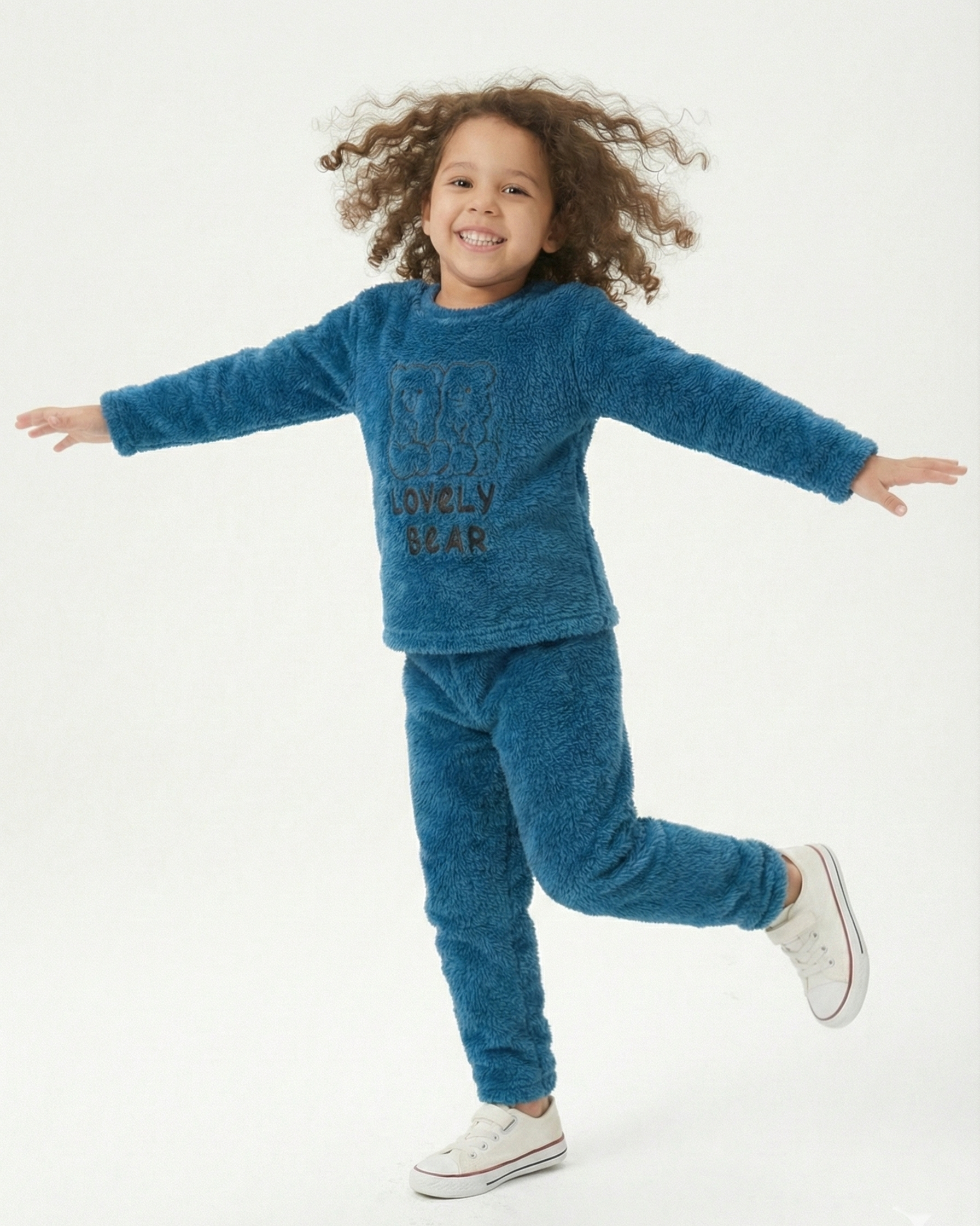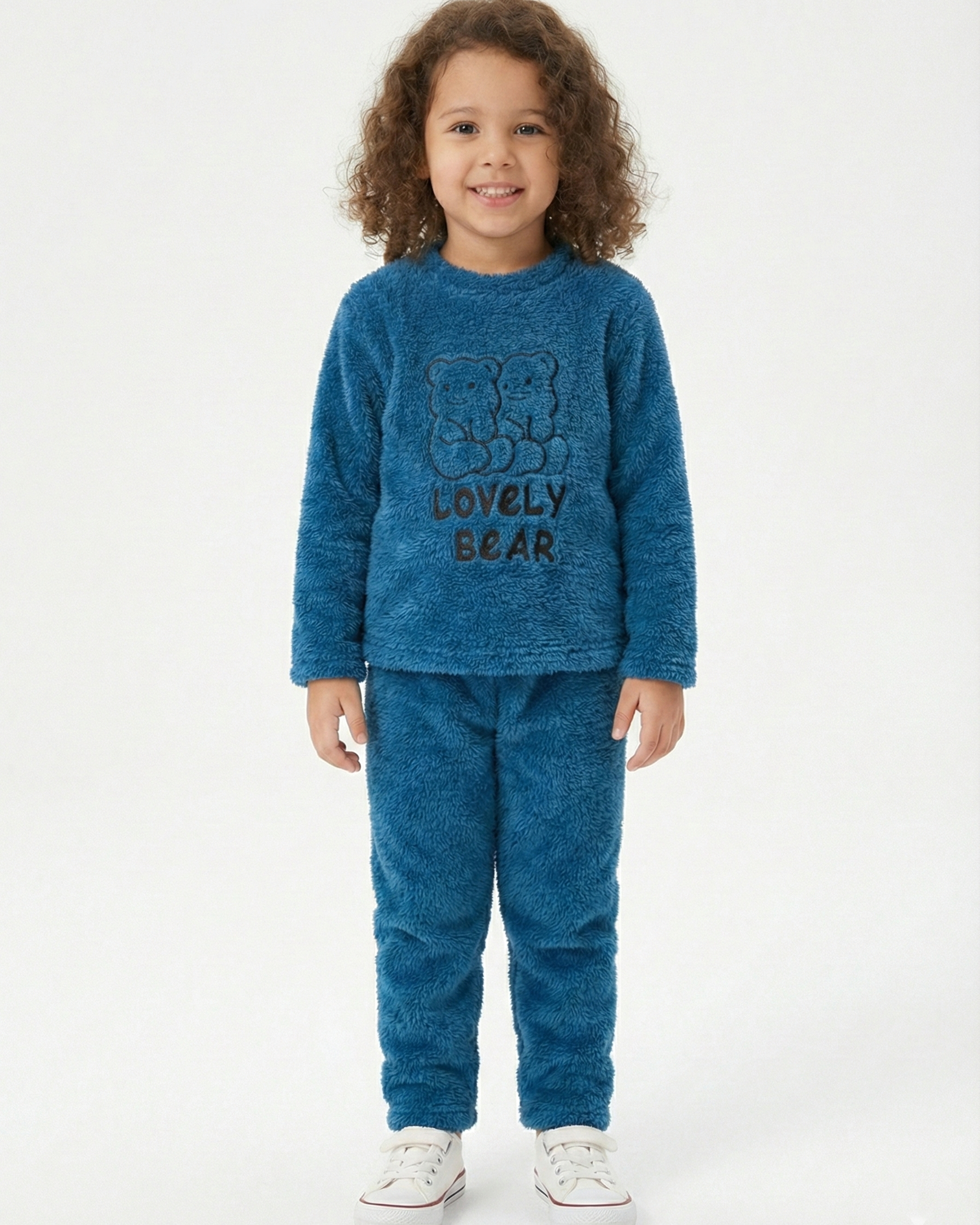 طقم بيجامة بناتي من الفرو الناعم (شيربا) باللون الأزرق. توفر تدفئة فائقة في ليالي الشتاء. مزينة بتطريز دبدوب (Lovely Bear). مقاسات من 6 إلى 16 سنة