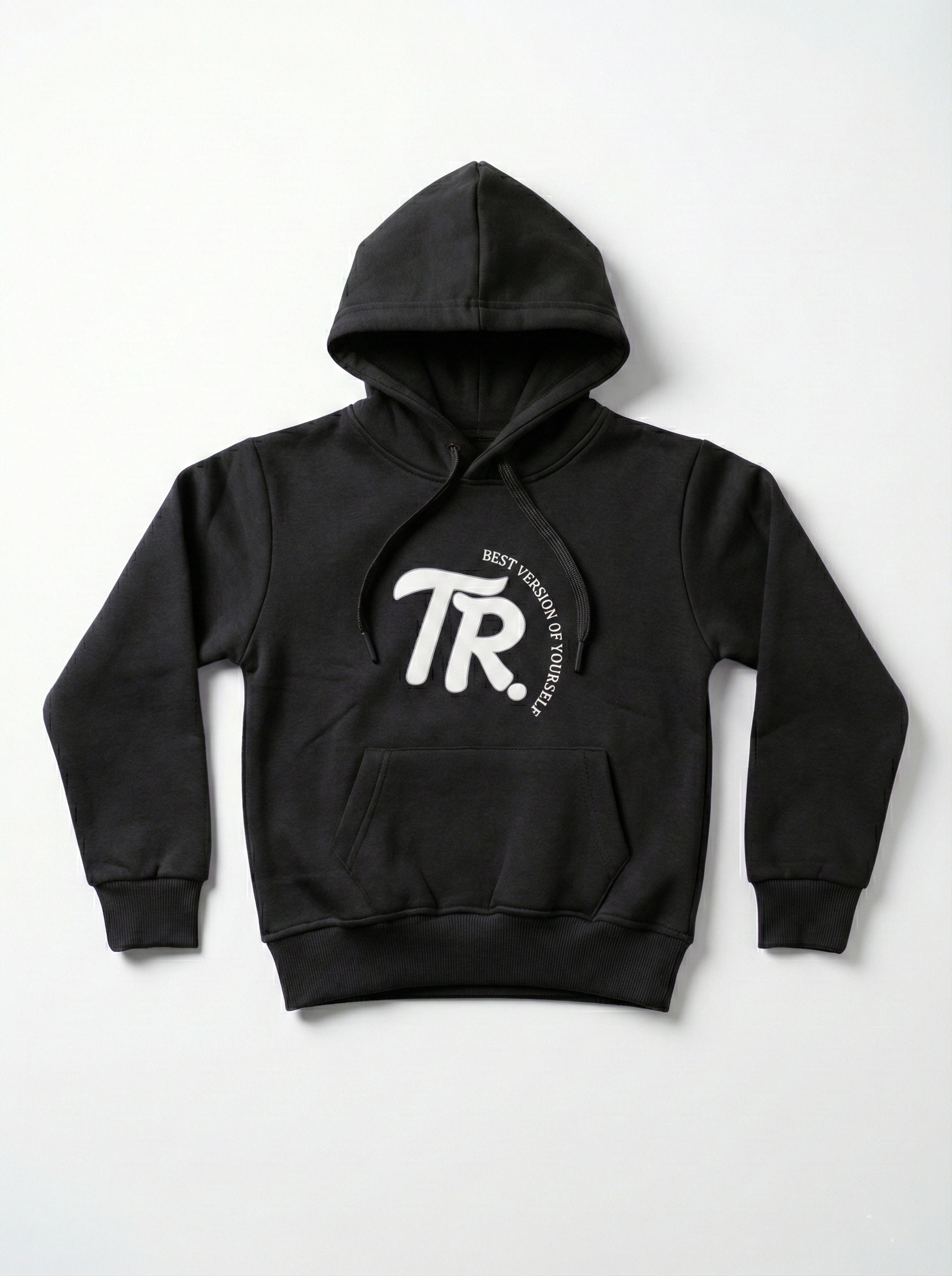 هودي بناتي باللون الاسود الجذاب بطبعة TR وشعار Best Version of Yourself. خامة ميلتون ثقيلة (65% قطن) لتدفئة الشتاء. متوفر بمقاسات من 6 حتى 18 سنة