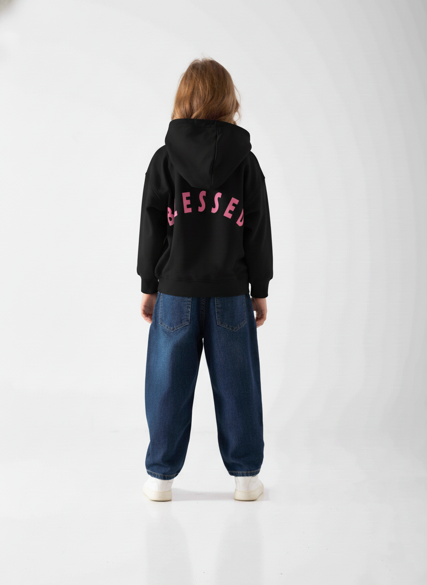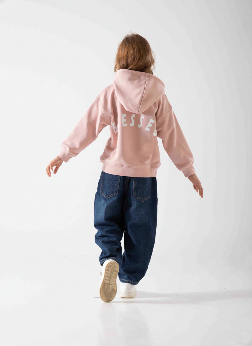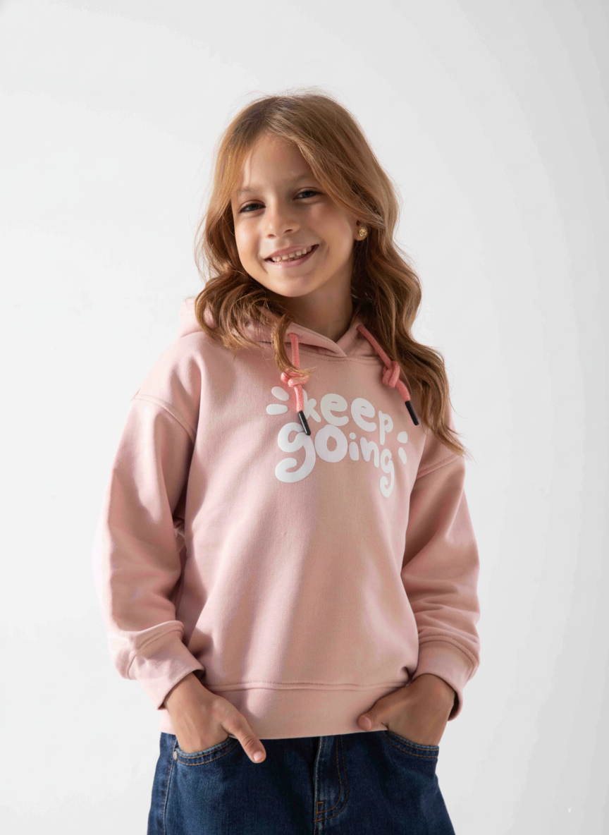هودي سويت شيرت بناتي عصري بلون وردي فاتح، بخامة سمر ميلتون عالية الجودة. يوفر راحة فائقة ومناسب للأجواء المعتدلة. متوفر بمقاسات من 6 إلى 18 سنة.